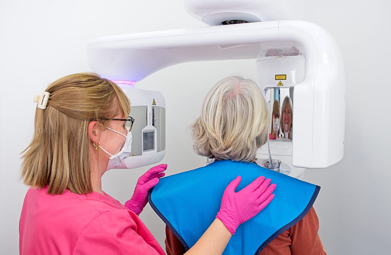 Wenn eine Behandlung ansteht, möchten wir Sie so schonend und sicher wie möglich versorgen. Dabei hilft uns modernste Technik: die digitale Volumentomographie (DVT). Damit erstellen wir dreidimensionale Aufnahmen von Zähnen und Kiefer – fast so, als würden wir einen Blick in Ihr Inneres werfen.